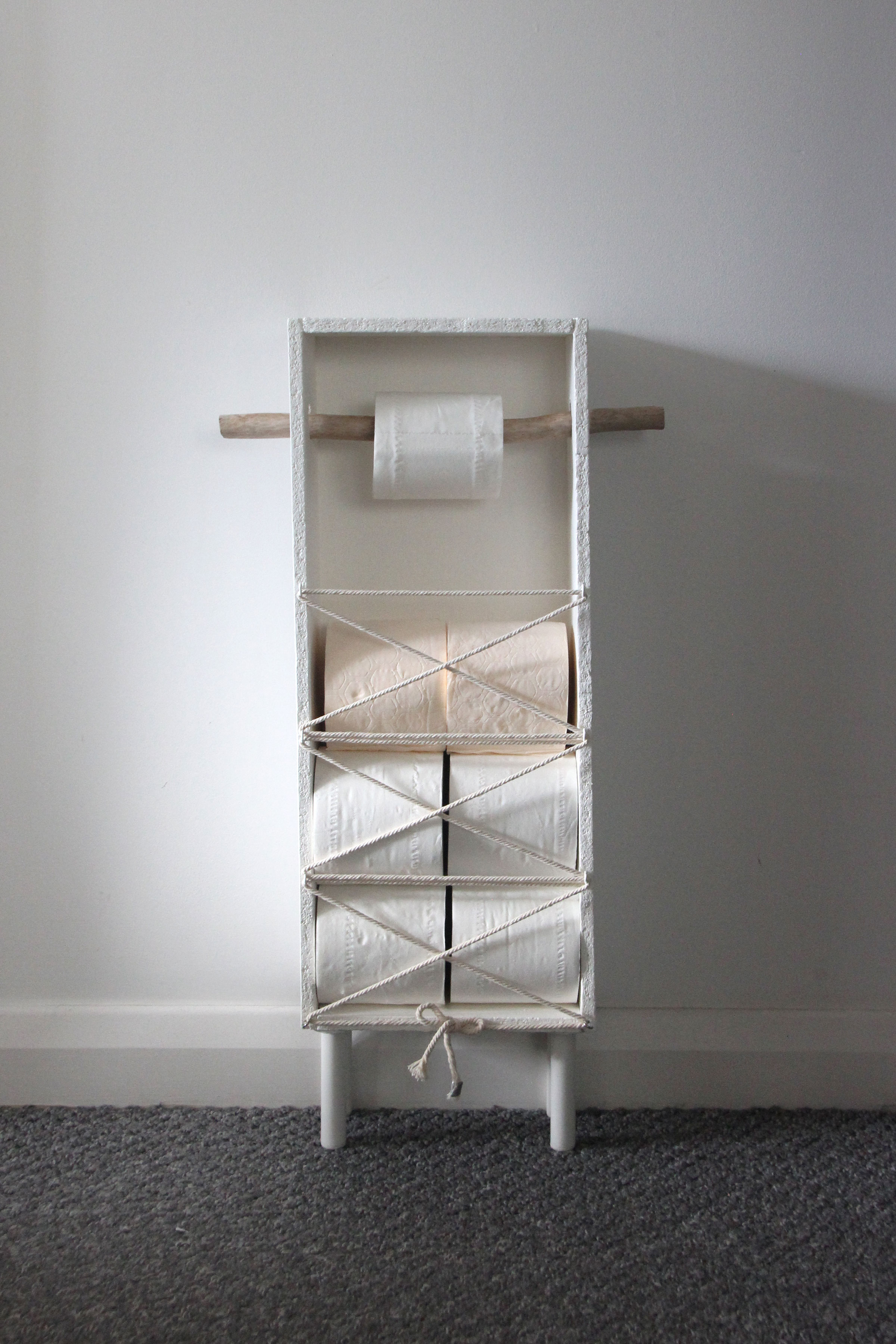 Wooden Chipboard, Tree Branch, Cotton Cord, Curtain Hooks, Discarded Cabinet Legs, Paint, Toilet Rolls,