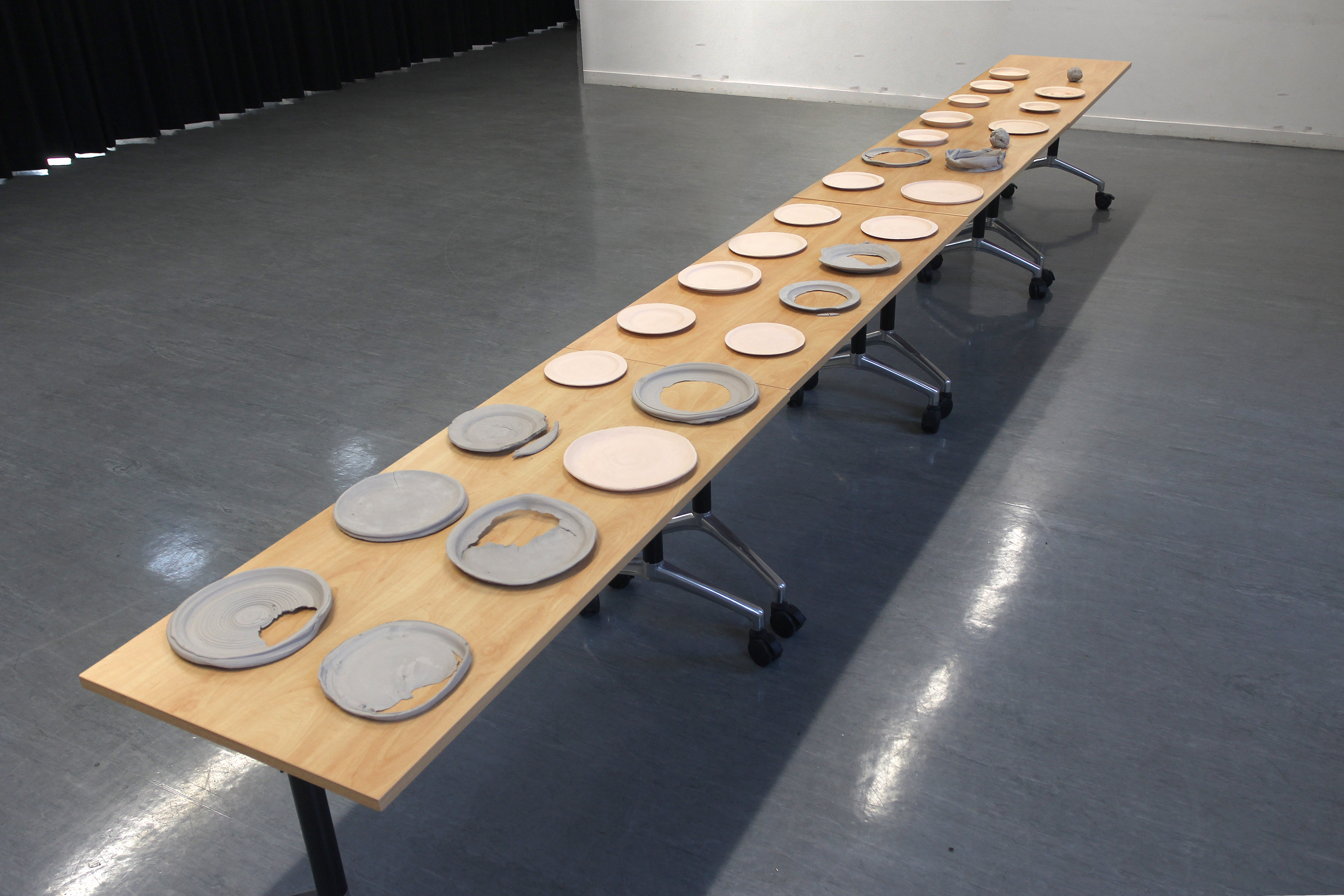 This process-driven work involved making 30 consecutive plates on the pottery wheel over several months, as I learnt the new skill. Each attempt was kept, regardless of their finished state – whether balled, broken or solid enough to be fired in the kiln.